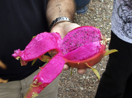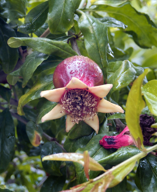 you never saw a pomegranite on it's tree before? well my first reaction was pomegranite's grow on trees? I have no idea where I supposed they came from, but of course from a tree. that was beautiful. Also I've heard of dragon fruit but have never seen one, what a gorgeous shade of pink on the inside I have never seen that in a fruit either. Ruhlman what does it taste like? just a fantastic garden.