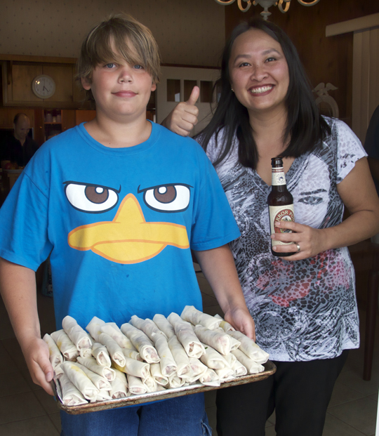 Think making and rolling spring rolls to fry is a chore?  Not when Diane's around.  She and James made these happen in twenty minutes, filled with pork, glass noodles and a couple kinds of fungus. Diane says these put Chinese egg rolls to shame (what with all their cabbage filling—hers were primarily meat).  Plenty to go around and plenty to freeze for later.