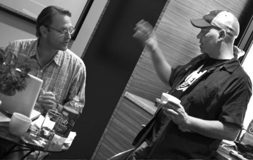 Chef Michael Symon and I working a few summers back on his book, Live to Cook. Photo by Donna Turner Ruhlman