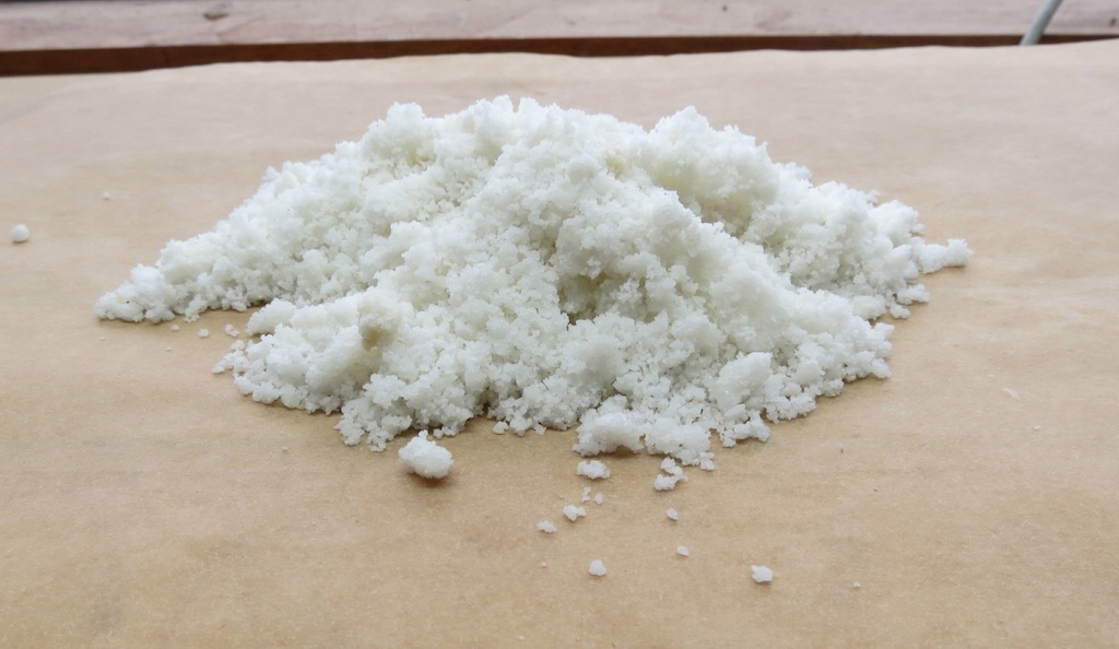 6. Scrape together and break it up with your fingers if you like big chunks or with a mortar and pestle to make it finer. You can also press it through a tamis or sieve.