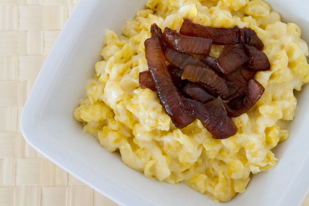 5. Once all of your spätzle are done, add them to the pan that you cooked the onions in. Turn the heat to medium and cook the spätzle for 2 minutes, tossing a few times to get them to heat evenly. Add the shredded cheese and remaining 3 tablespoons of heavy cream, stirring until all the cheese is melted. Salt and pepper to taste. Serve immediately, topped with a teaspoon of caramelized onions.