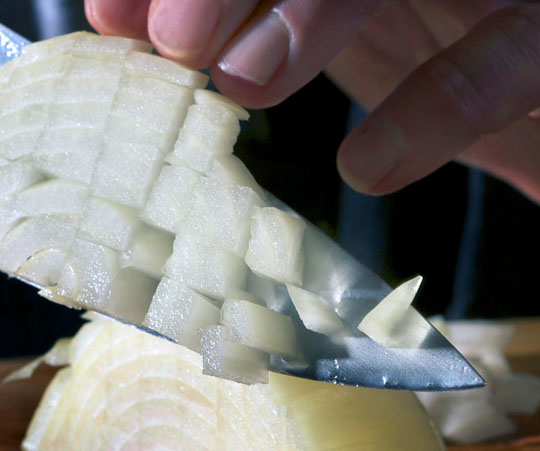 Our chef's knife for the last 10 years or so was a decent brand available at local kitchen supply retailers (Chicago Cutlery), but just not a great knife. No matter how well Bob honed or sharpened it, it just didn't slide through food as it should; our two small Shun knives were telling us what to do, but we didn't realize it, because, well, it *was* a decent knife, right?
