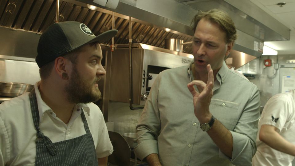 Mike Lata, right, at The Ordinary, describing the plateau de mare. Highlight, the lobster ceviche.