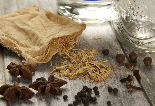 Ingredients for homemade bitters: the woody shreds are Angelica root, the bitter component, along with aromatics, star anise, pepper, cloves, allspice. Photos by Donna Turner Ruhlman
