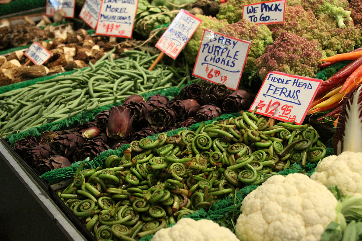 Next week it's to the other coast, starting with Seattle. Come see me Tuesday night; I hope to have big food conversation at Elliott Bay! Free drinks for all! (Or the first ten to show.) The photo above is by Denise Sakaki, Sosios Produce in Pike Place Market. According to my friend who sent it, "They are my favorite (and most local chef-types' favorite) booth in the market by far for their careful curation and seasonal produce, such as ramps, fiddleheads, morels, and the like."