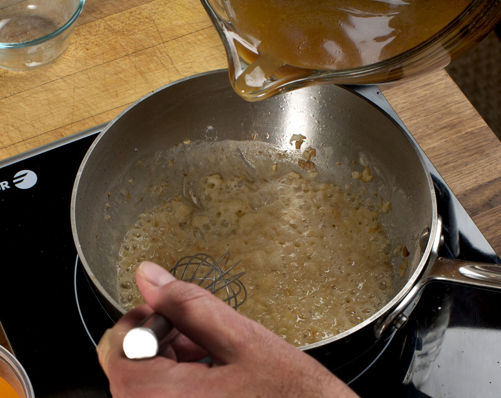 3. Turn the burner to high and pour in the stock, whisking continuously as you do.