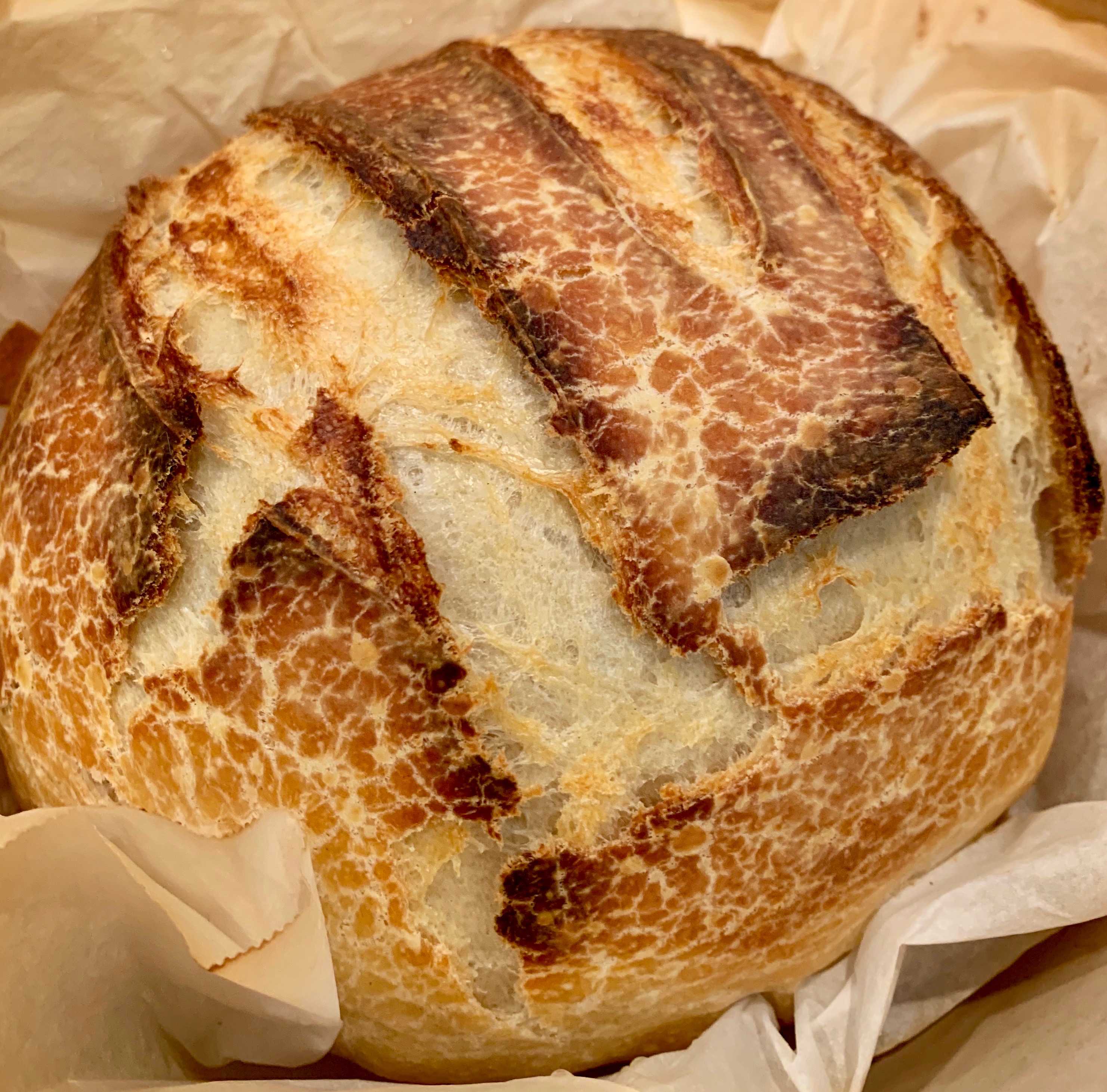 I baked it as is now standard: in a preheated Dutch Oven, 500˚F, 20 minutes covered 30 minutes uncovered: