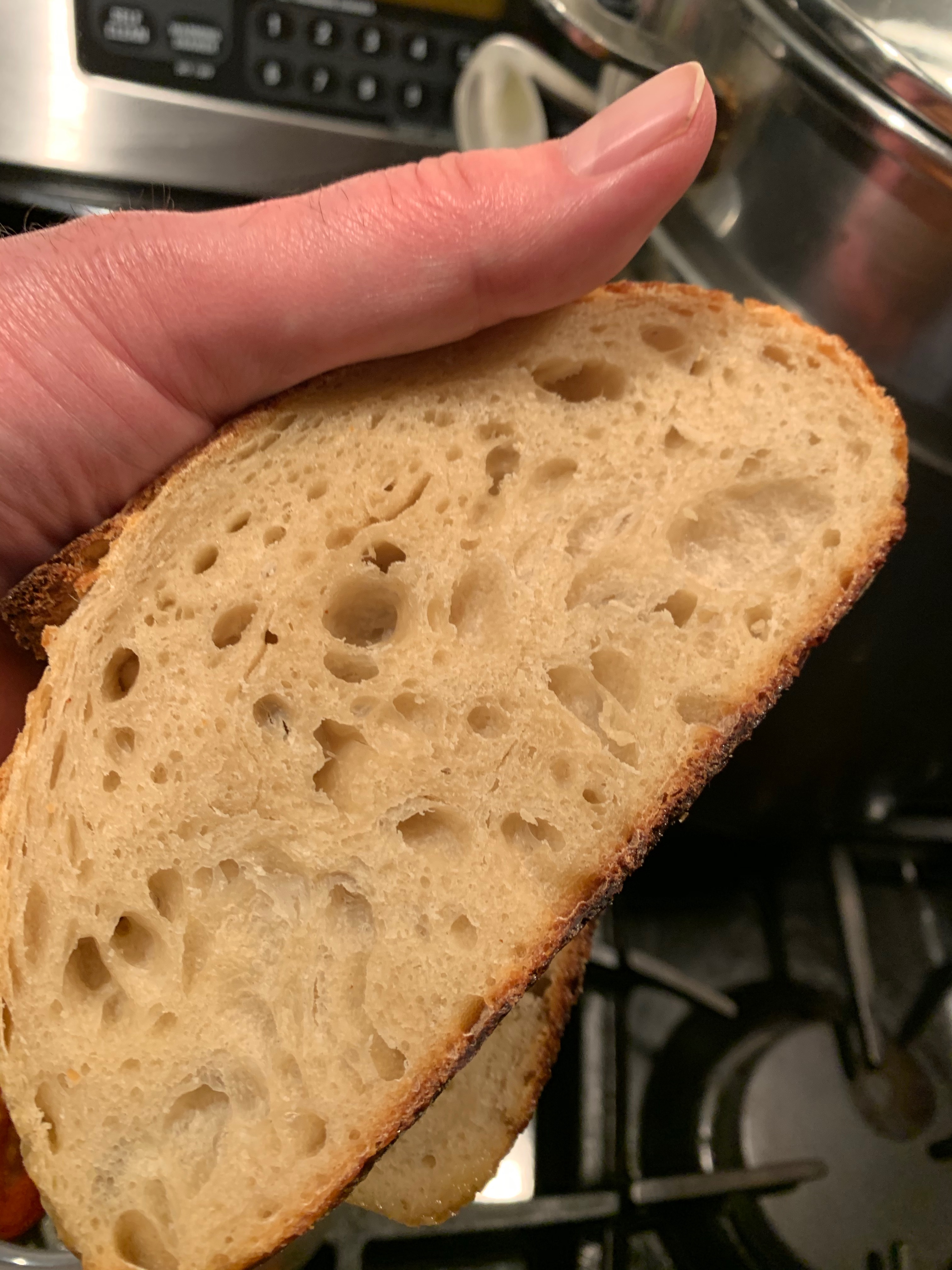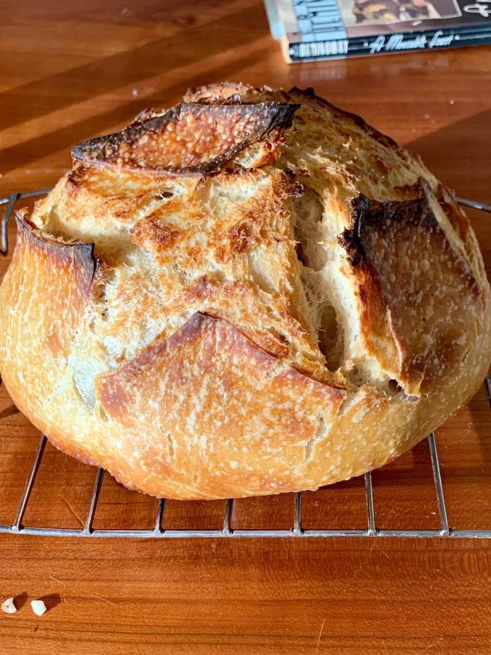 I went back to my old ratio of 2 parts flour, 1 part starter, 1 part water (500 grams flour, 250 grams each water and starter or 1 pound flour and ½ pound starter and water) plus 1.5% to 2% salt (a tablespoon or so). And after considerable folding and rising, baked something the people wanted to eat. (Remember that the starter is equal parts flour and water if you weigh, which means you can know exactly how much flour and water you have in your dough.)
