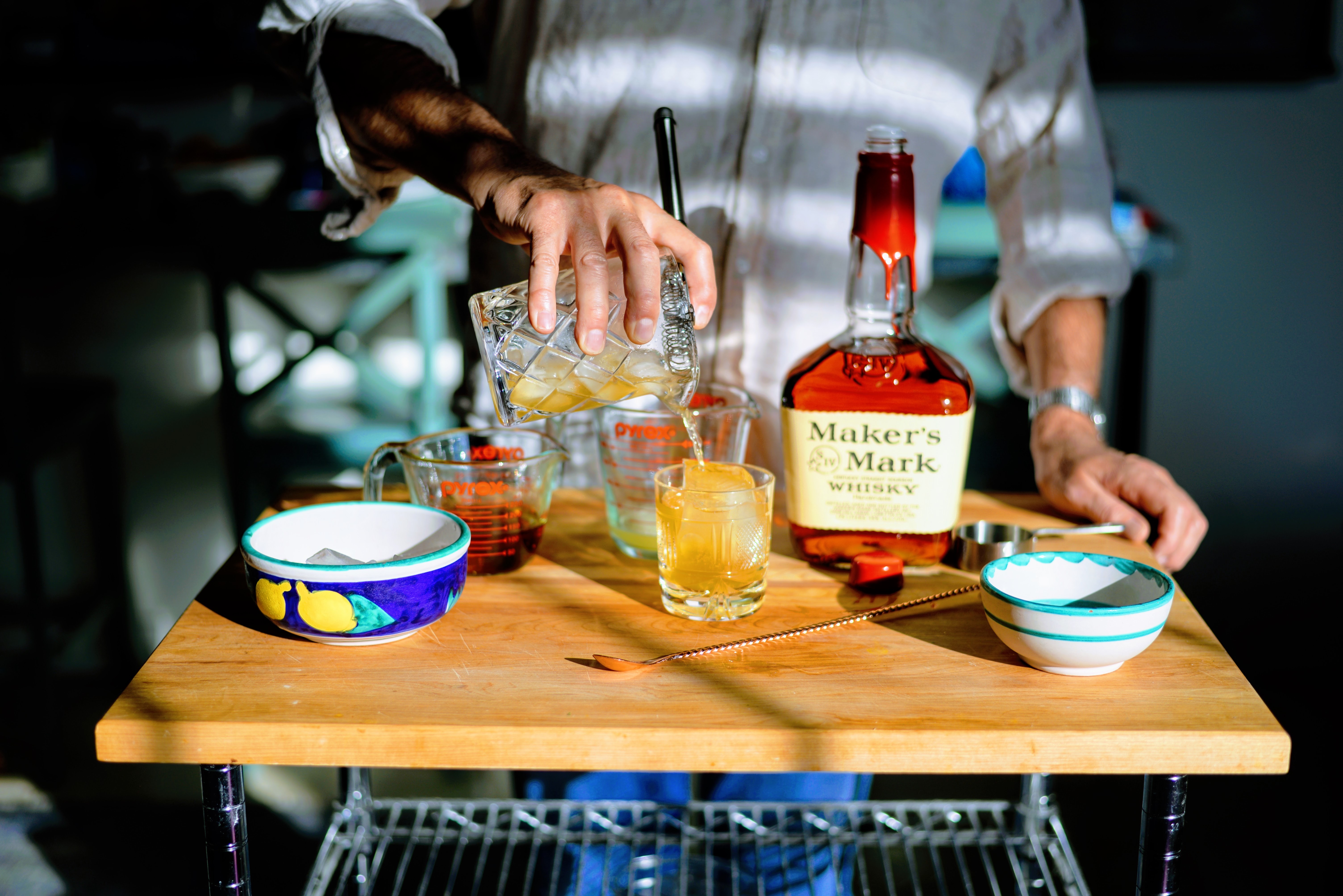 - Combine ¼ cup of the simple syrup with the lemon juice and bourbon in a mixing glass. Fill it with ice, stir and strain over ice into two glasses.
