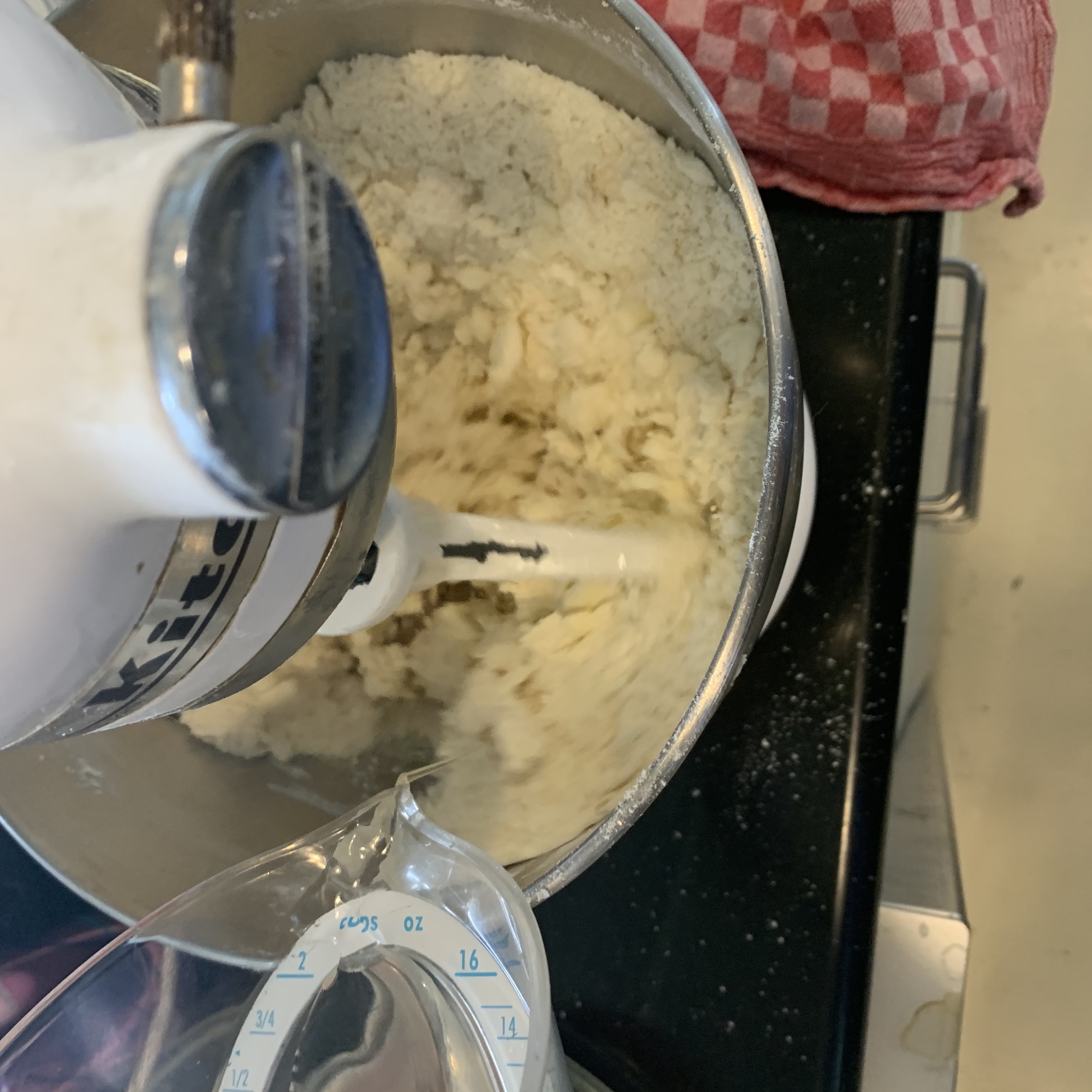 I make mine in a mixer but you can do it by hand as well. First flour and fat are mixed, followed by ice cold water.