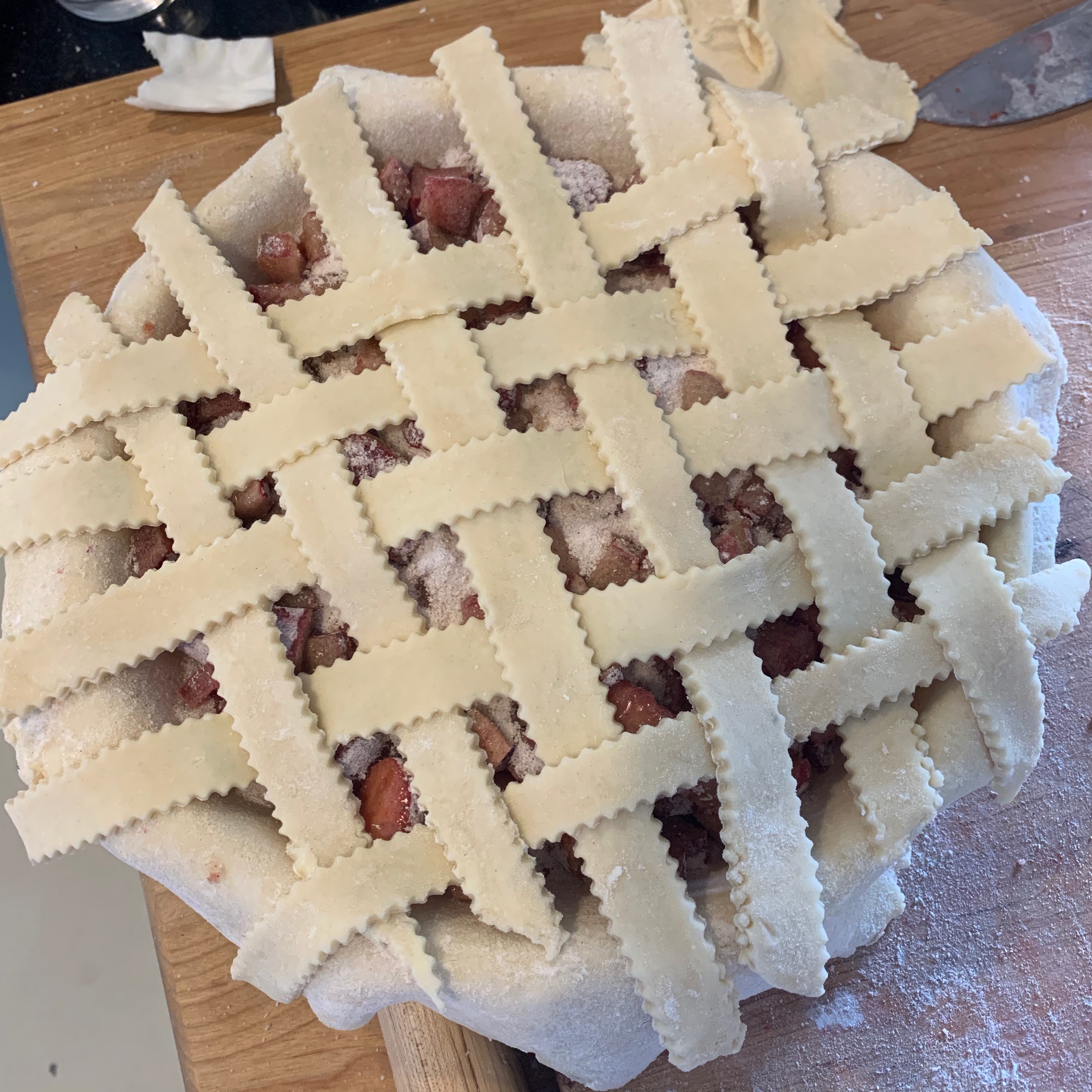 Lay out 6 strips vertically. Then interlace them by folding alternating vertrical strips down, laying a horizontal strip across, then folding the opposite vertical strips down, and so on, until you have covered the pie with a lattice. The lattice crust, besides being pretty, allows more evaporation of the very juicy rhubarb than a closed lid crust.