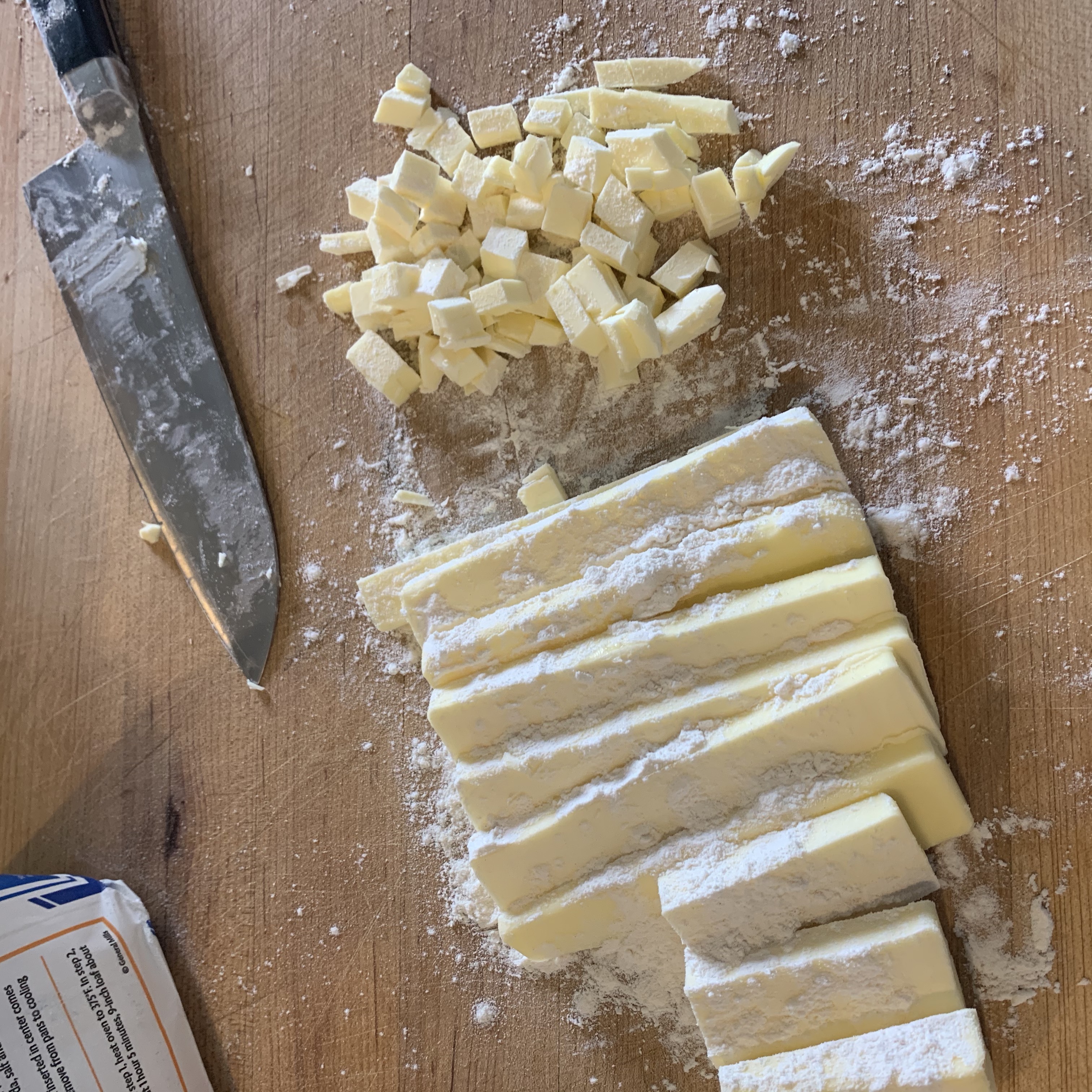 • 10 ounces butter, small dice (dust your butter with flour to make the dicing easier)