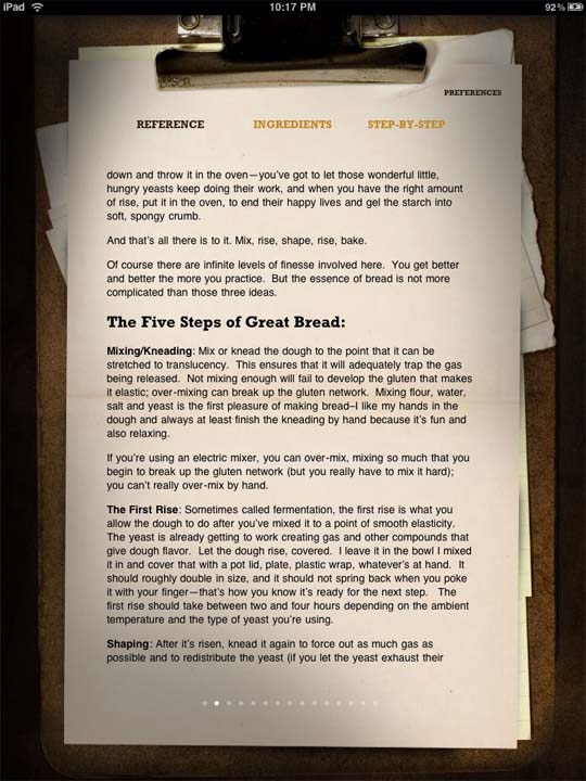 Our new Bread Baking Basics has arrived in the iTunes store: http://bit.ly/breadbaking ($1.99). It'a full-throttle application for iPad with personalized recipes for all kinds of bread—white, sourdough, whole wheat, whole wheat sourdough, rye, rye sourdough, multi-grain and multigrain sourdough, ciabattas, baguettes, boules, loafs, and pizza dough. Just tell it how you mix your dough (with a mixer or by hand), how you want to measure ingredients (ounces, grams, or cups) and all recipes will be generated in that format. To bake bread, choose the type of bread you want, the shape, the baking surface and how much you want, and it will generate a personalized recipe for you and your kitchen with step-by-step instructions and photos.